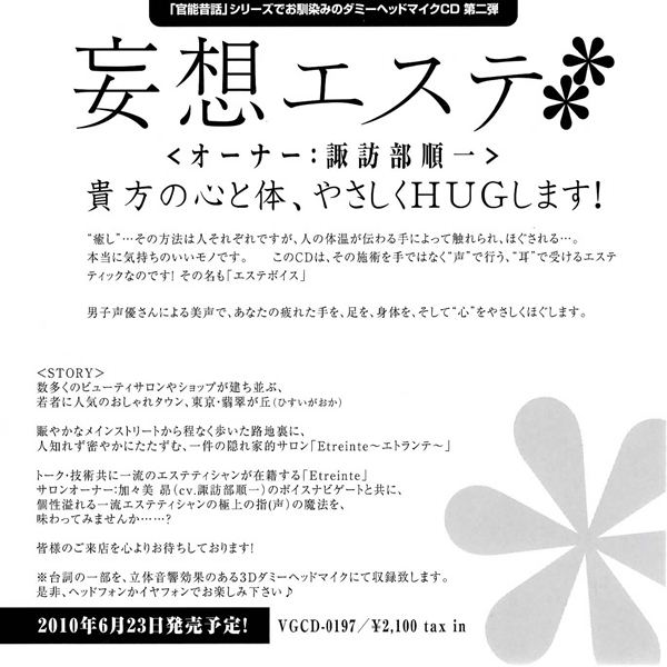 画像を確認して頂ければ解ると思いますが(クリックすると拡大されます)、発売日は2010年6月23日だそうです。諏訪部さんはオーナーという事なので、もしかしたら他の役者さんも出演されたりとかするのかな、なんて思っていたりしますがどうなんでしょう。かなり興味がありますので詳細が発表になるのを楽しみにしたいと思います。